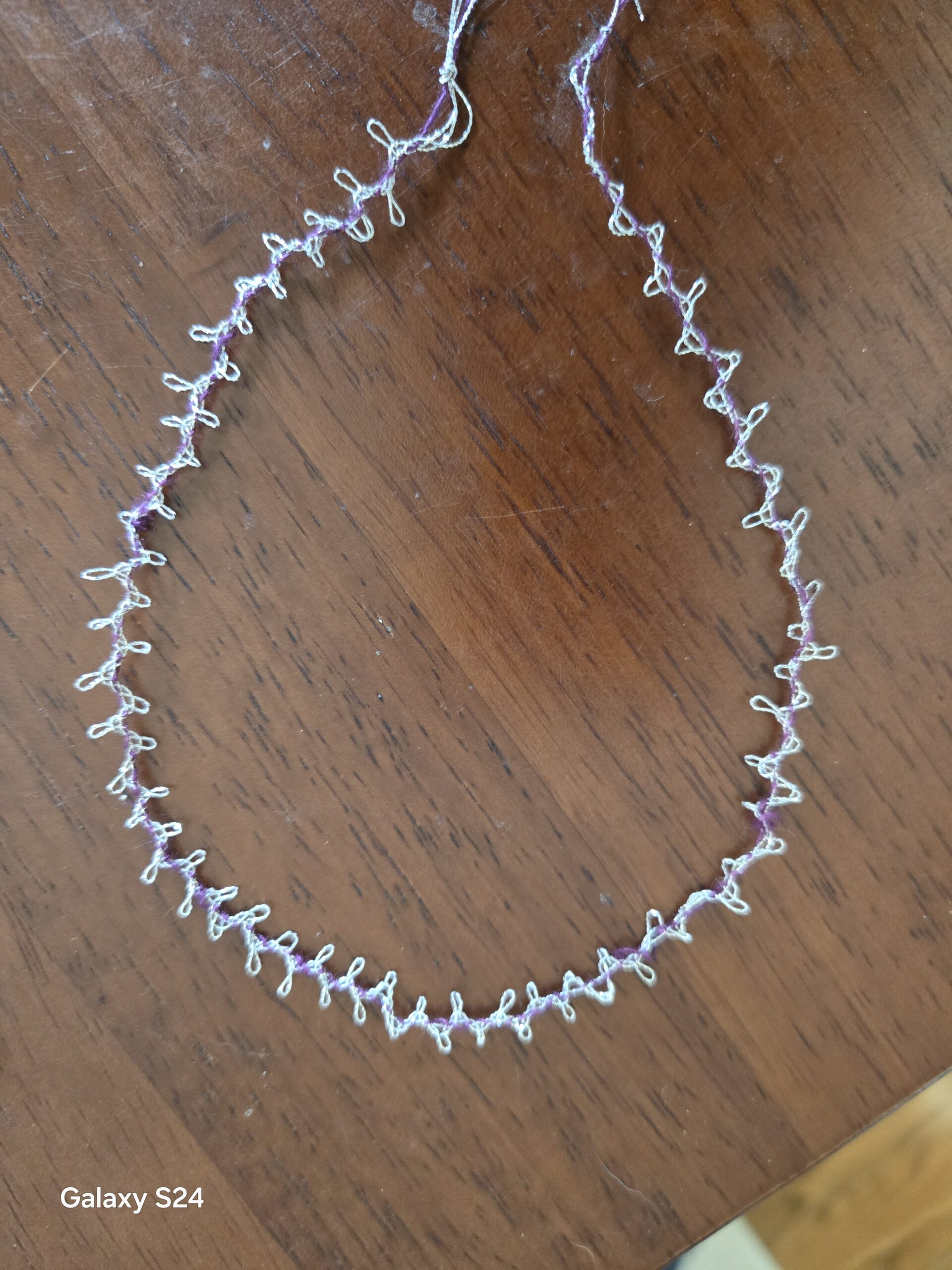 In this, my renewed pursuit of figuring out how to translate a pattern into lace, I give you “Two Pair Braids” from Gilian Dye’s Gold & Silver Edgings Sixteenth & Seventeenth Century Lace Book 1. I used some “metallic” thread and purple linen from my stash. […]